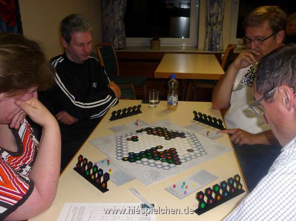 Mit zwei Teams war der Spielekreis zur Regionalen Vorausscheidung zur Deutschen Mannschaftsmeisterschaft im Brettspiel 2012 nach Odenthal gereist. Trotz guter Vorbereitung reichte es für Team "Hiespielchen" mit Raimund Dreier, Friedel Hoffmann, Stefan Kopacz und Hartmut Thordsen wie im Vorjahr nur für Platz 3 mit 51 Punkten und der geringen Chance als Reserveteam doch noch ins Finale nach Herne zu kommen.